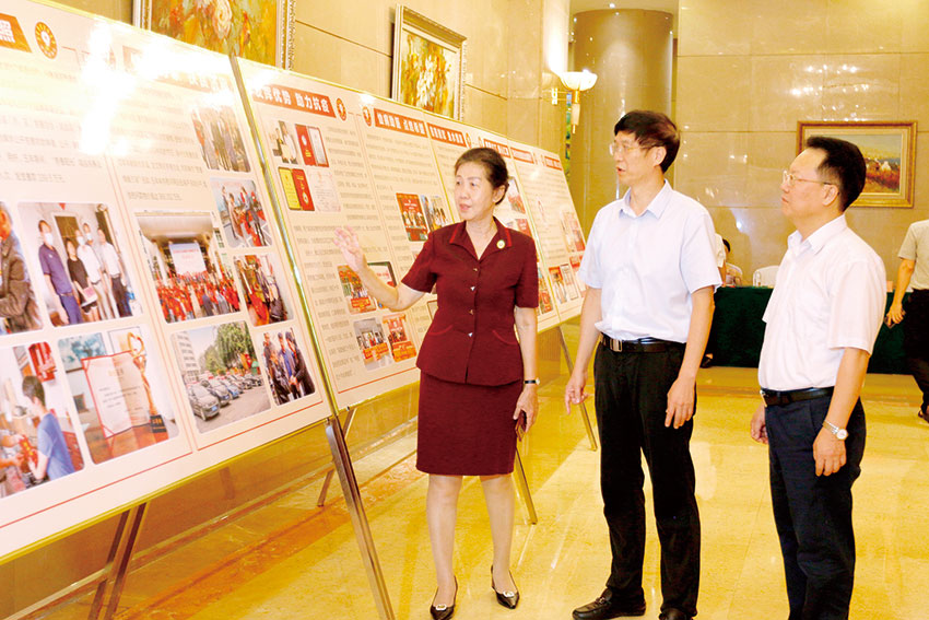 游婉玲(左1)參加漳州市第八個“中華慈善日”主題宣傳活動,觀看宣傳展板