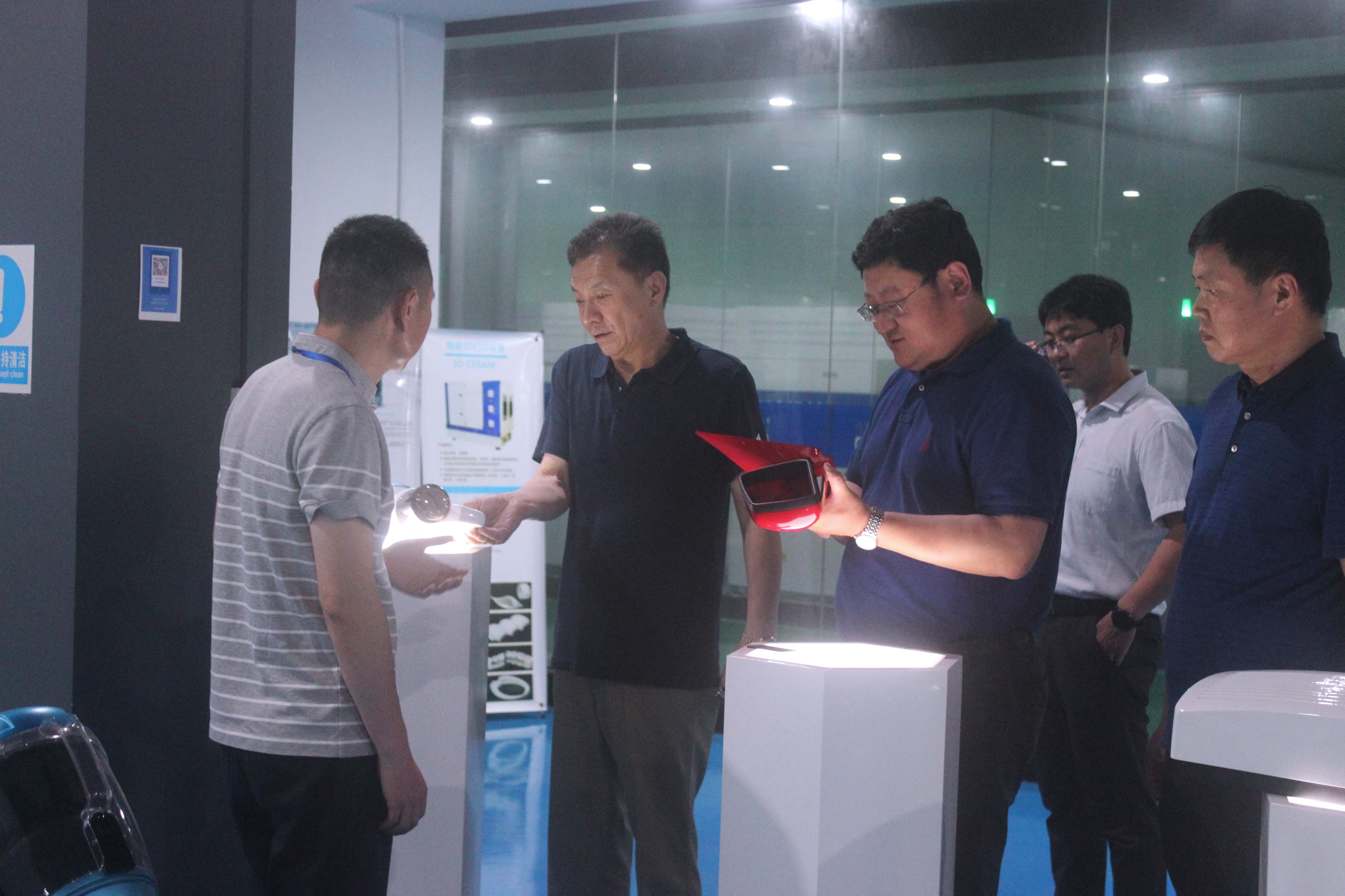 為了進一步了解3D打印技術(shù),在3D打印樣品間,陶董向領(lǐng)導(dǎo)們一行展示了通過后處理的3D打印成品,與領(lǐng)導(dǎo)一行熱烈探討了3D打印在家電、汽車、醫(yī)療等行業(yè)的應(yīng)用與發(fā)展,并就浙創(chuàng)科技3D打印在科普教育領(lǐng)域的成果進行了簡單交流,獲得了領(lǐng)導(dǎo)們的一致好評。